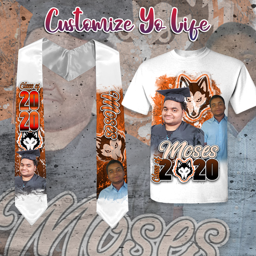 Grad Stoles, Custom Stole, Custom Graduation Stole. Includes Two Photos, Graduate Name, Logo/Mascot, And Custom Design Colors. Or a Printed Stole with the same terms as the half-printed stole