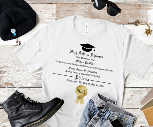 A custom graduation shirt is a perfect keepsake for your graduate. It will be personalized with your name, 1 picture, and the theme colors.