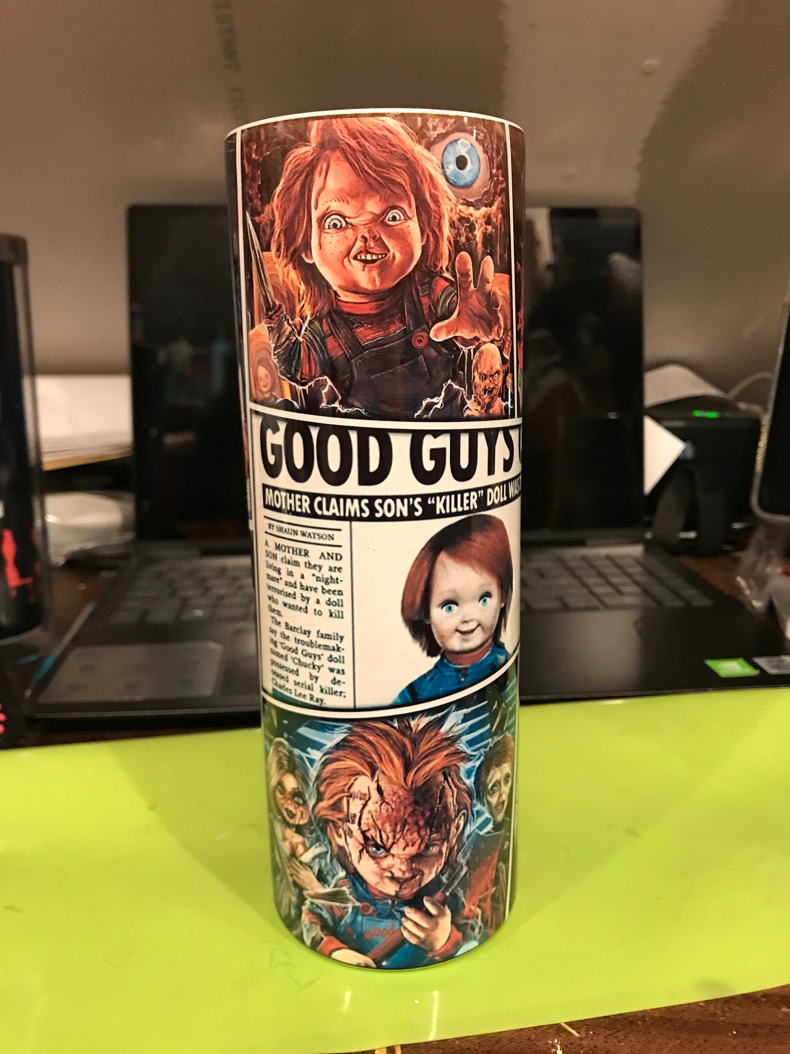 We couldn't resist calling it Chucky headlines.Discover the perfect gift for any occasion: our unique 12oz, 20oz, and 30oz Skinny Tumblers! Vacuum insulated and double-walled stainless steel, they'll keep your hot drinks hot and cold drinks cold. Comes with a metal straw, straw cleaner, and a lid.