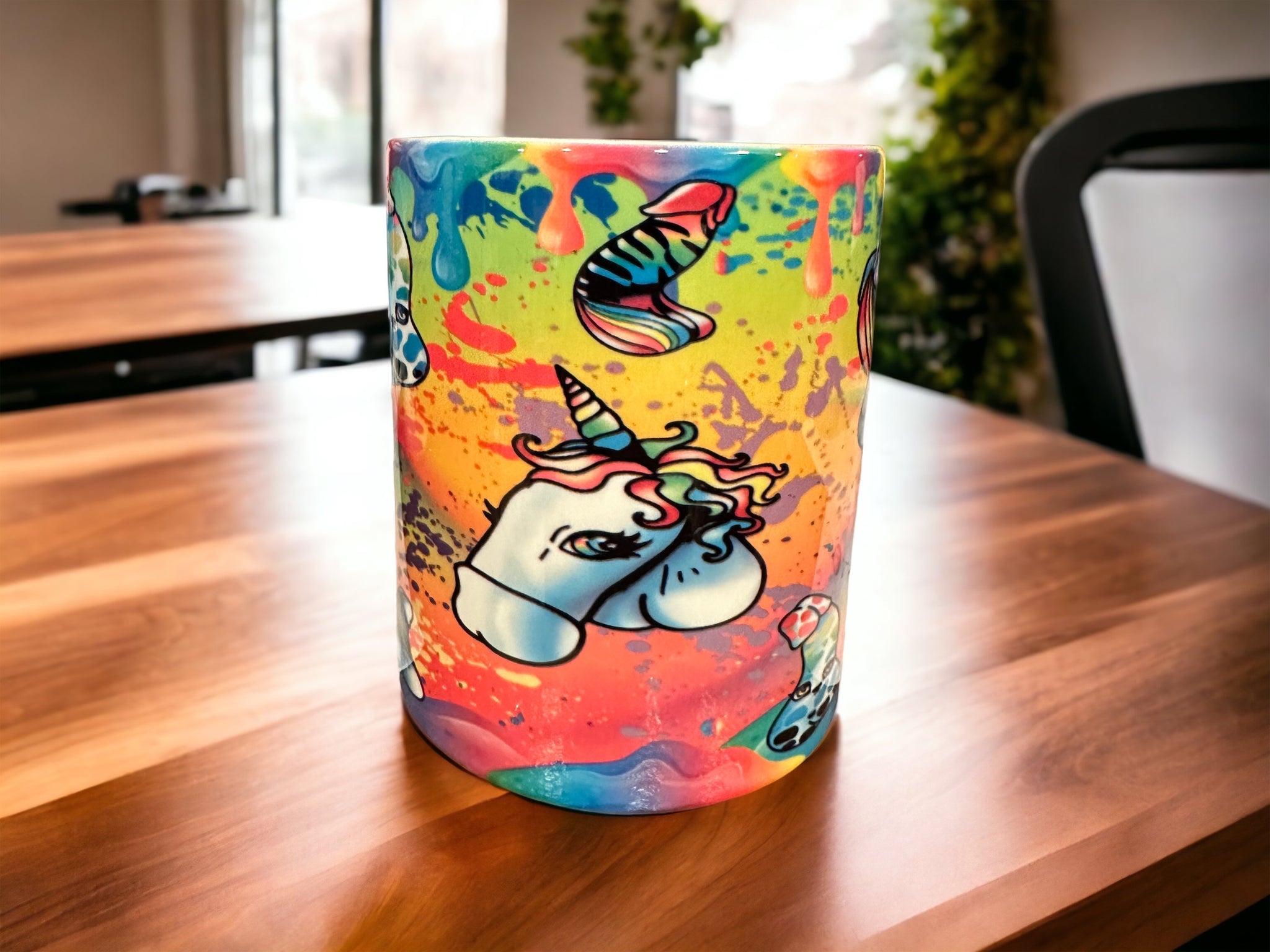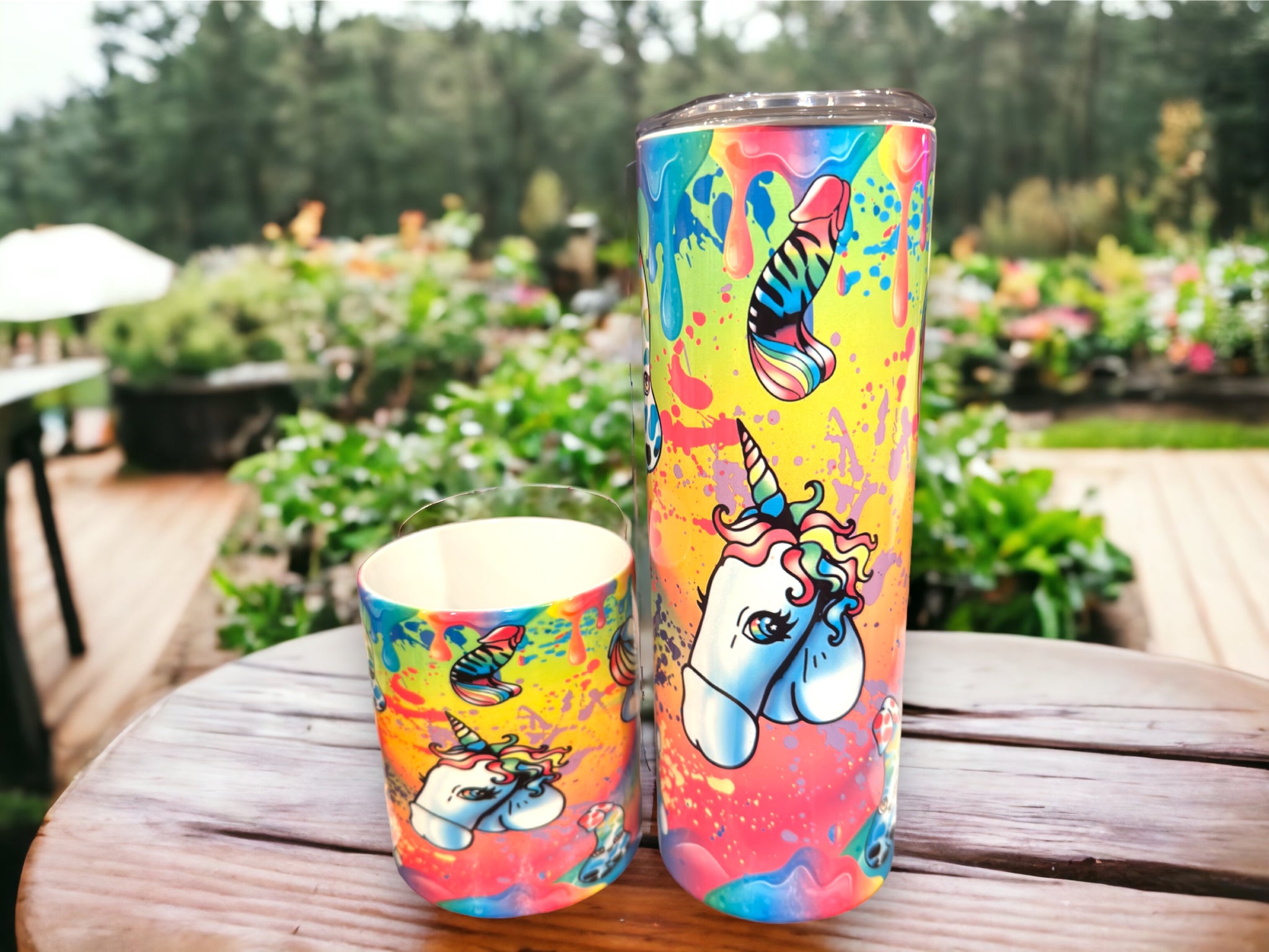 our unique, 20oz, tumbler and 10oz coffee mug with Rainbow Unicorn Penis design!