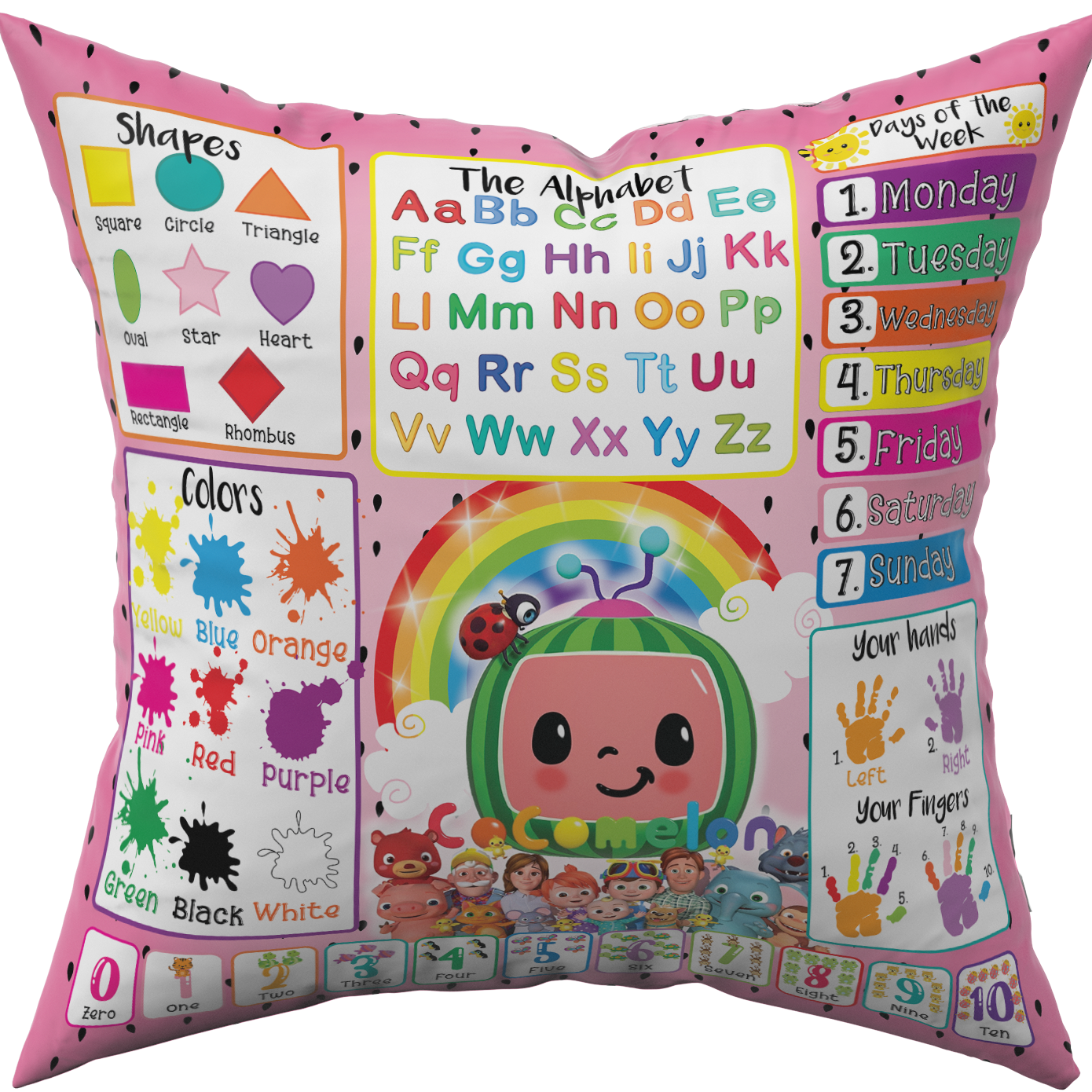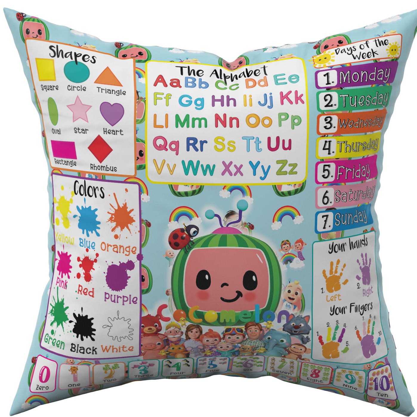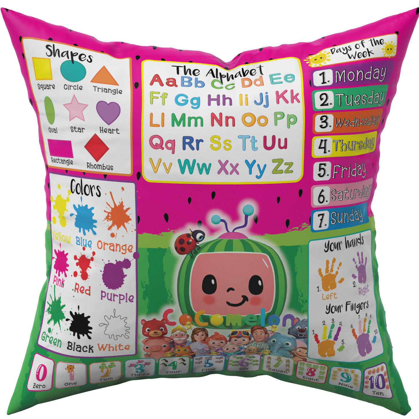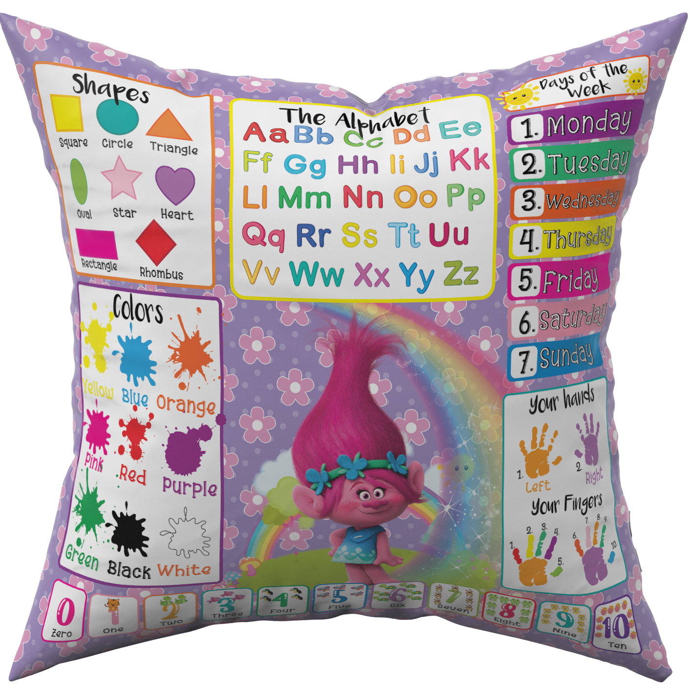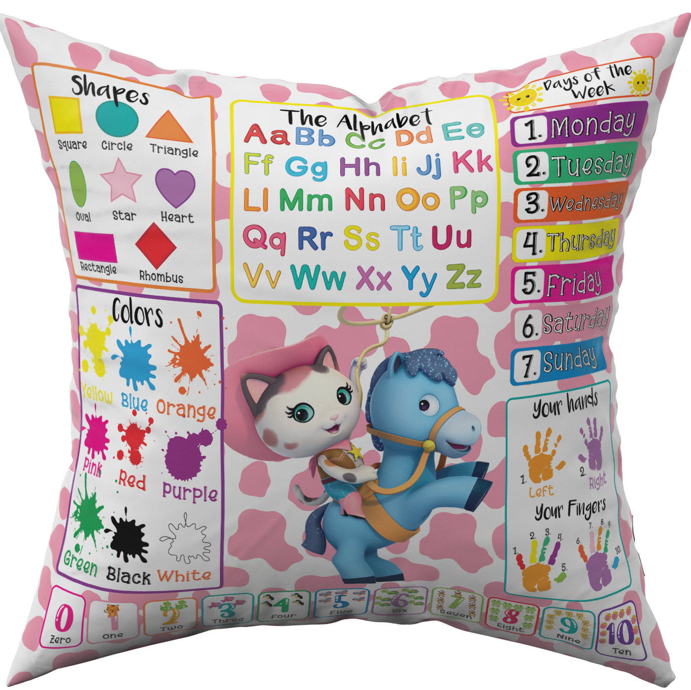 Character inspired that's really cute and fun for kids to learn. Personalize with the child's name so they can learn to spell their name. With this pillow they can learn the days of the week, colors, letters and shapes and more with this fun pillow! Makes a great birthday or Christmas gift.