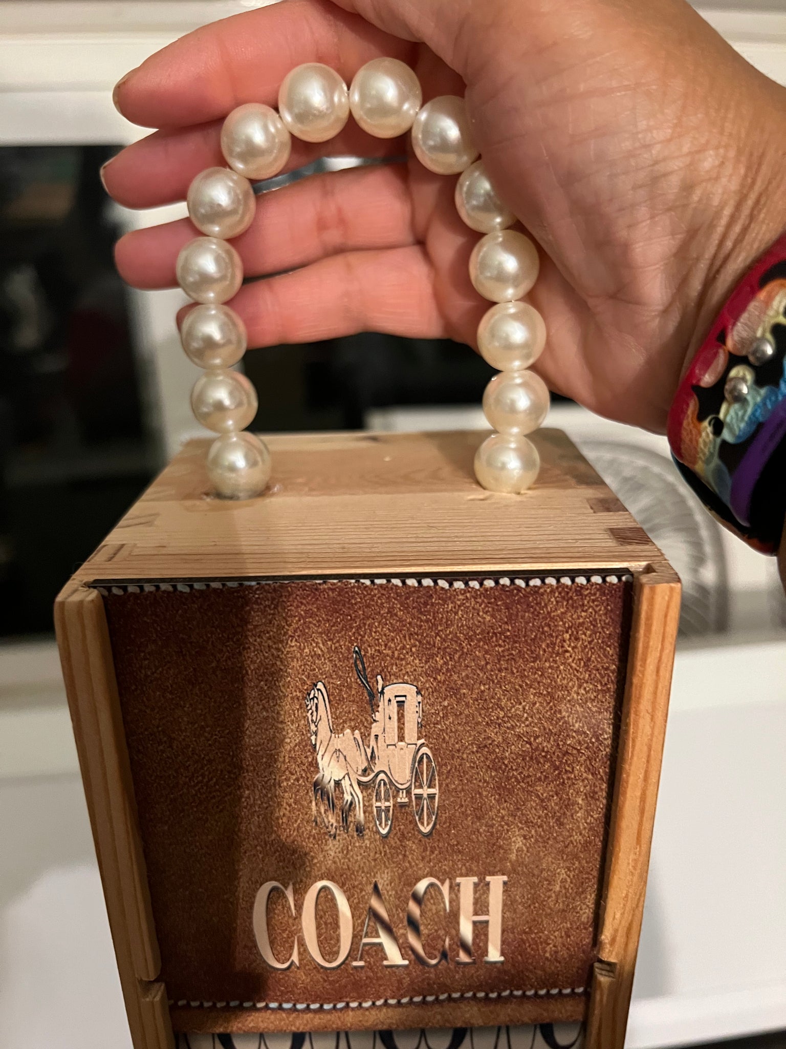 The handle is made of pretty white pearls or just a plan white rope handle as well.