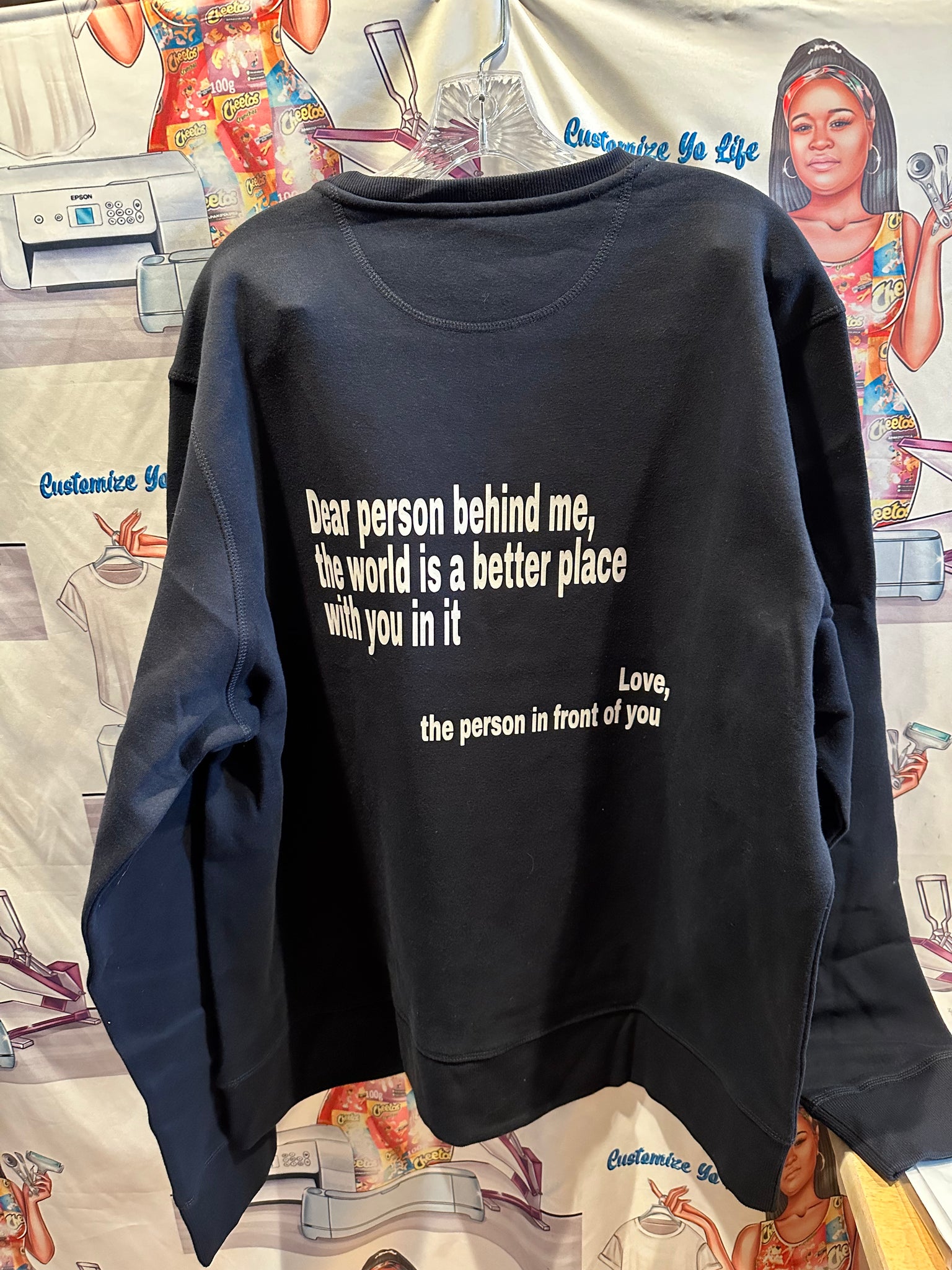 Experience the powerful and inspiring message of Dear Person Behind Me You Are Enough with our selection of sweatshirts, available in multiple colors on our website. Need help finding the color you want? Let us know and we'll find a way to make it happen.