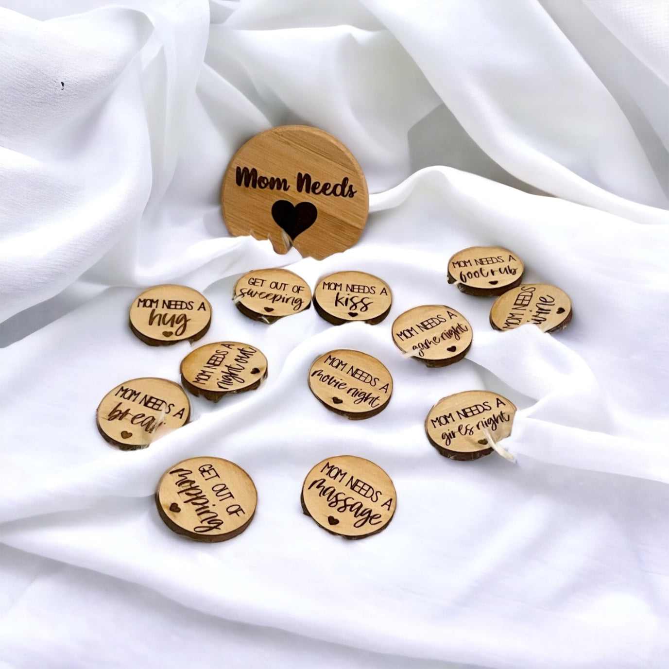 Make your Mom feel special with Mom Needs Tokens! Our unique wooden tokens are the perfect way to show Mom that you care and are thinking of her. Every set comes with 30 tokens, so you can create special moments and brighten your day anytime and anywhere. Celebrate your #1 with Mom Needs Tokens and let her know how much she means to you!