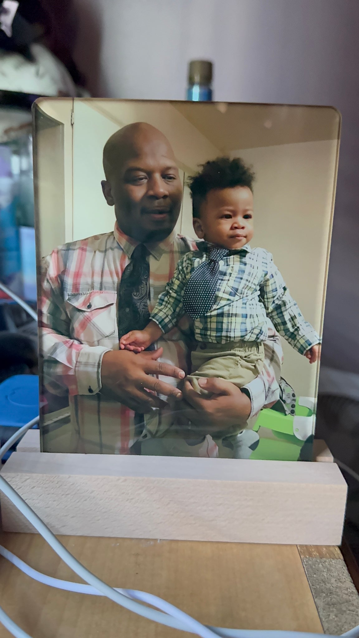Enhance your decor with our 5" x 7" personalized acrylic photo lamp, complete with a wood stand and USB interface.
