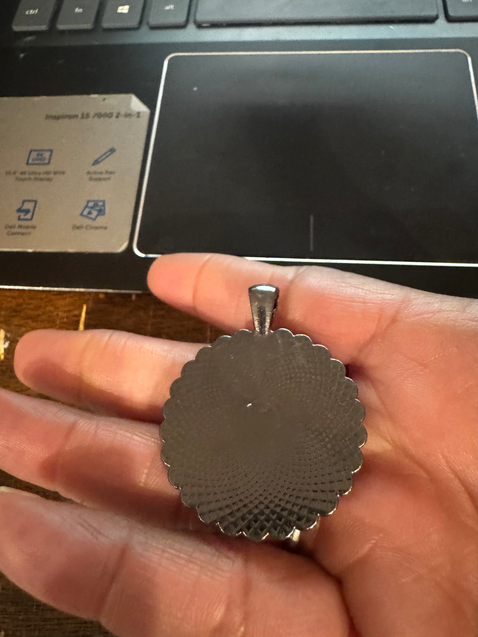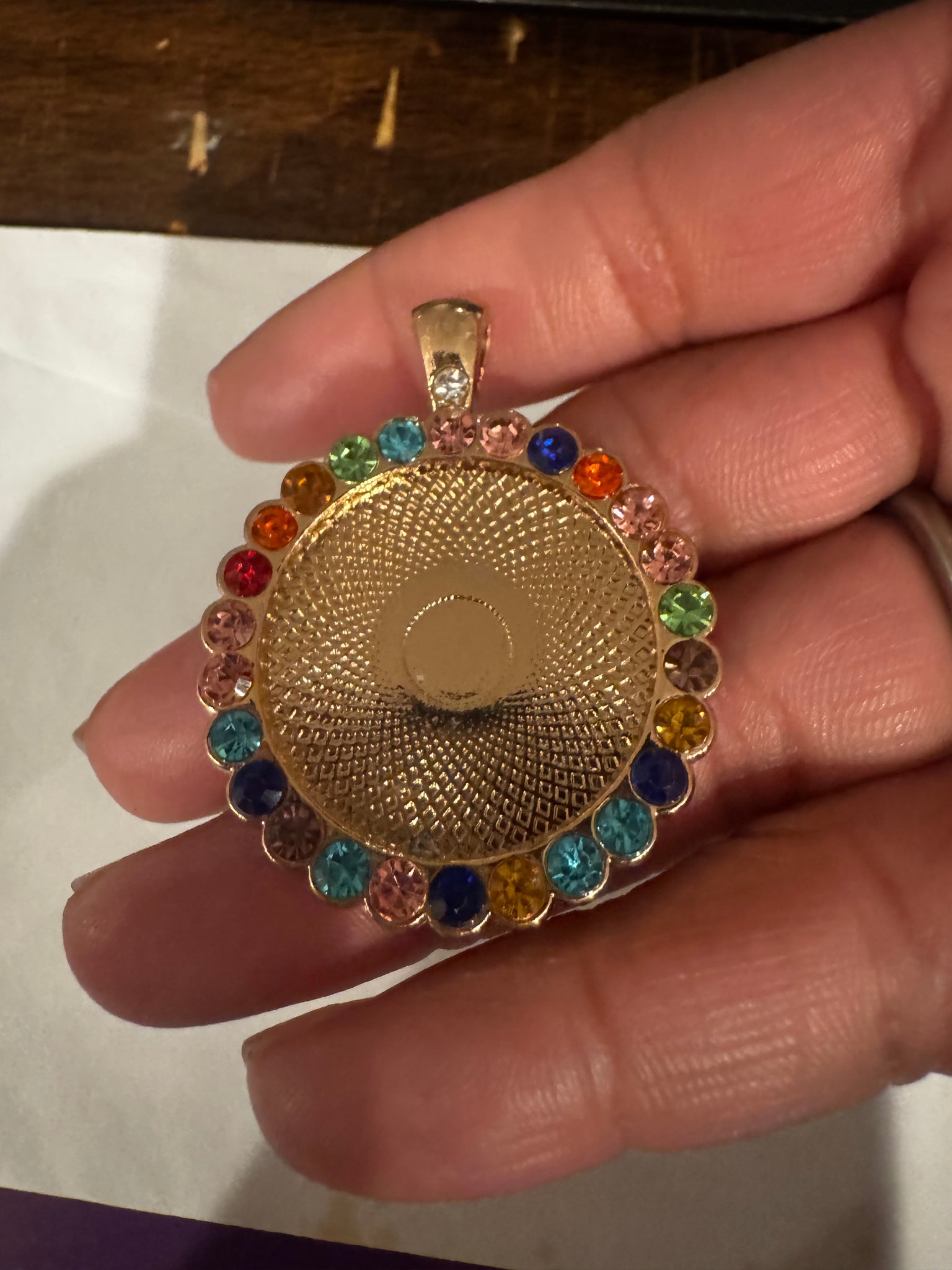 The Personalized Circle photo charm and photo pendant are available in multiple colors, including gold, rose gold, silver, and black. Each color, except silver, features varying bling options around the picture.