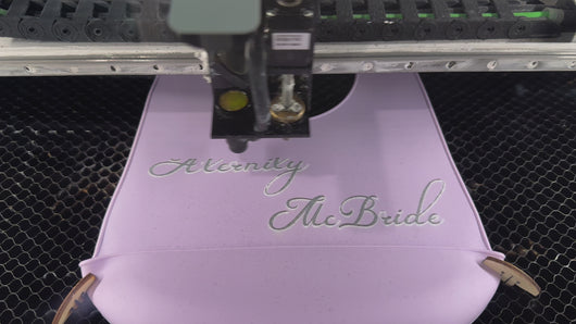 The bibs are laser engraved. There is no coloring or paint, the engraved areas are a shade different than the bib color.